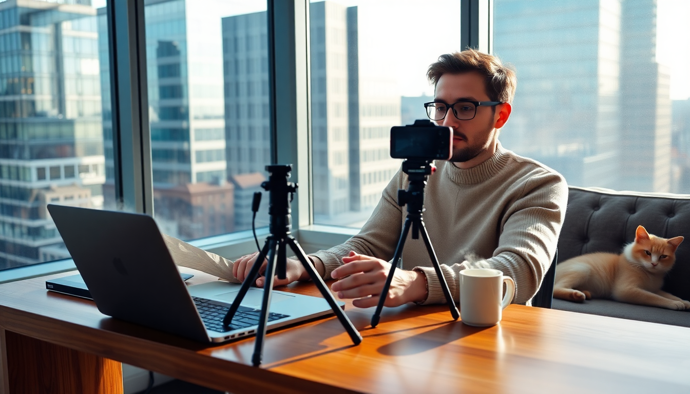 - A podcaster mid-conversation, surrounded by warm studio glow.